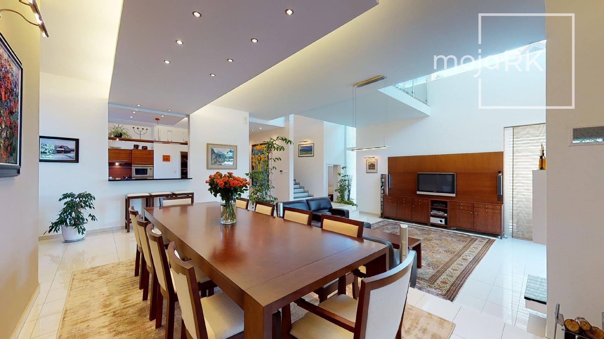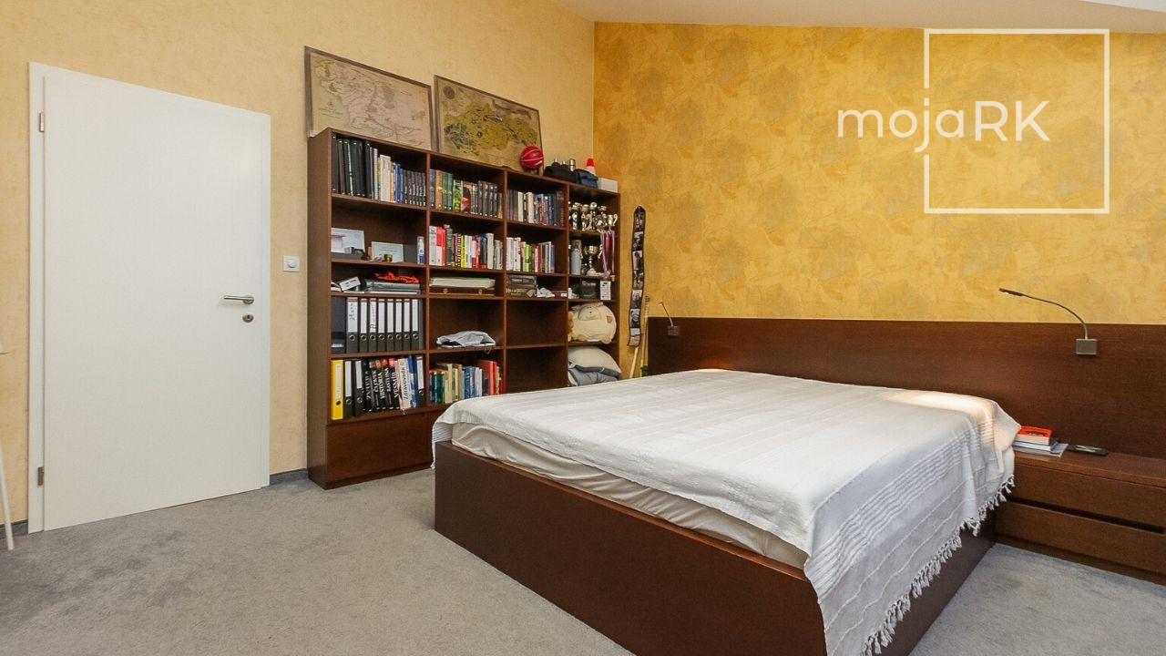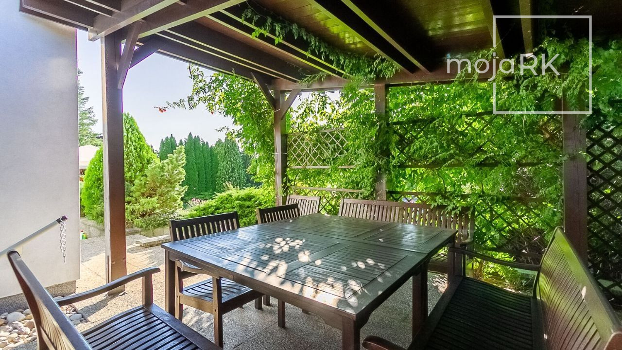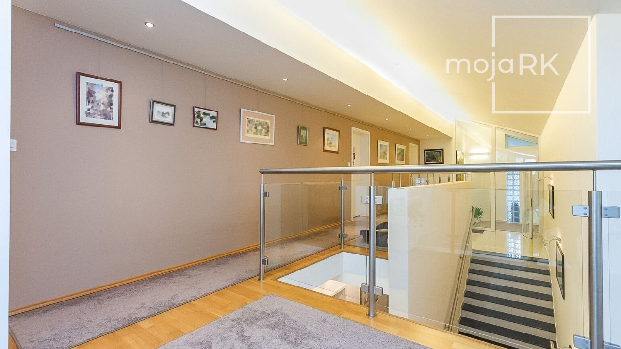 Úžitková plocha domu 422 m2 ponúka: 3 spálne so samostatnými šatníkmi a kúpeľňami, wellness priestor, hosťovskú izbu so samostatnou kúpeľňou, veľkoryso riešenú obývaciu miestnosť prepojenú s jedálňou s krásnym výhľadom na záhradu, kuchyňu so samostatnou komorou, šikovne dispozične umiestnenú pracovňu, galériu, ďalšie dva šatníky, 5 x WC, práčovňu, technickú miestnosť, 2 skladovacie miestnosti, garáž 44,30 m2 pre dve autá s úložným priestorom. Ďalšie 3 parkovacie miesta sa nachádzajú na nádvorí pozemku so zámkovou dlažbou.