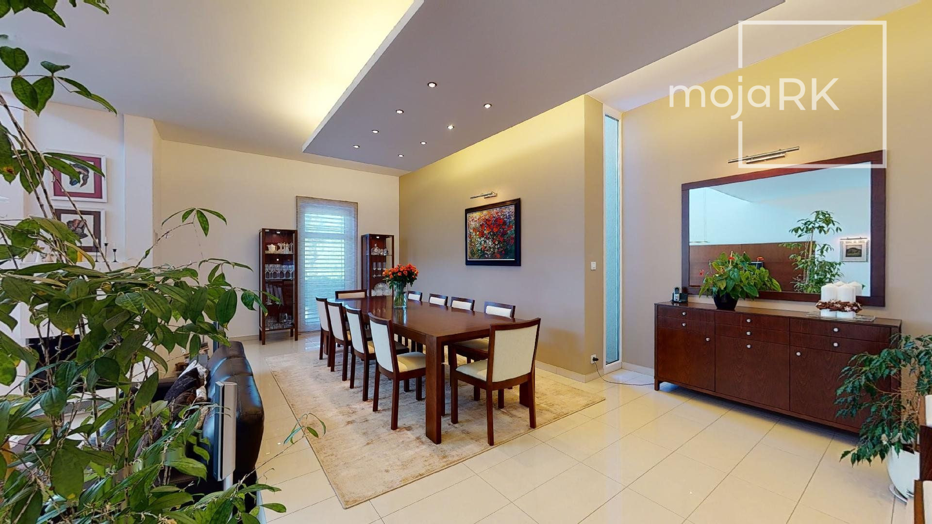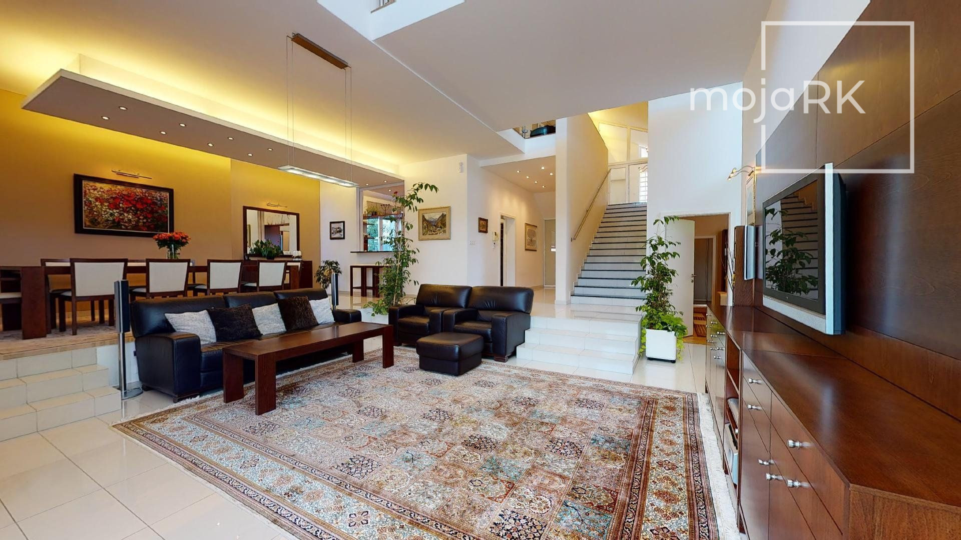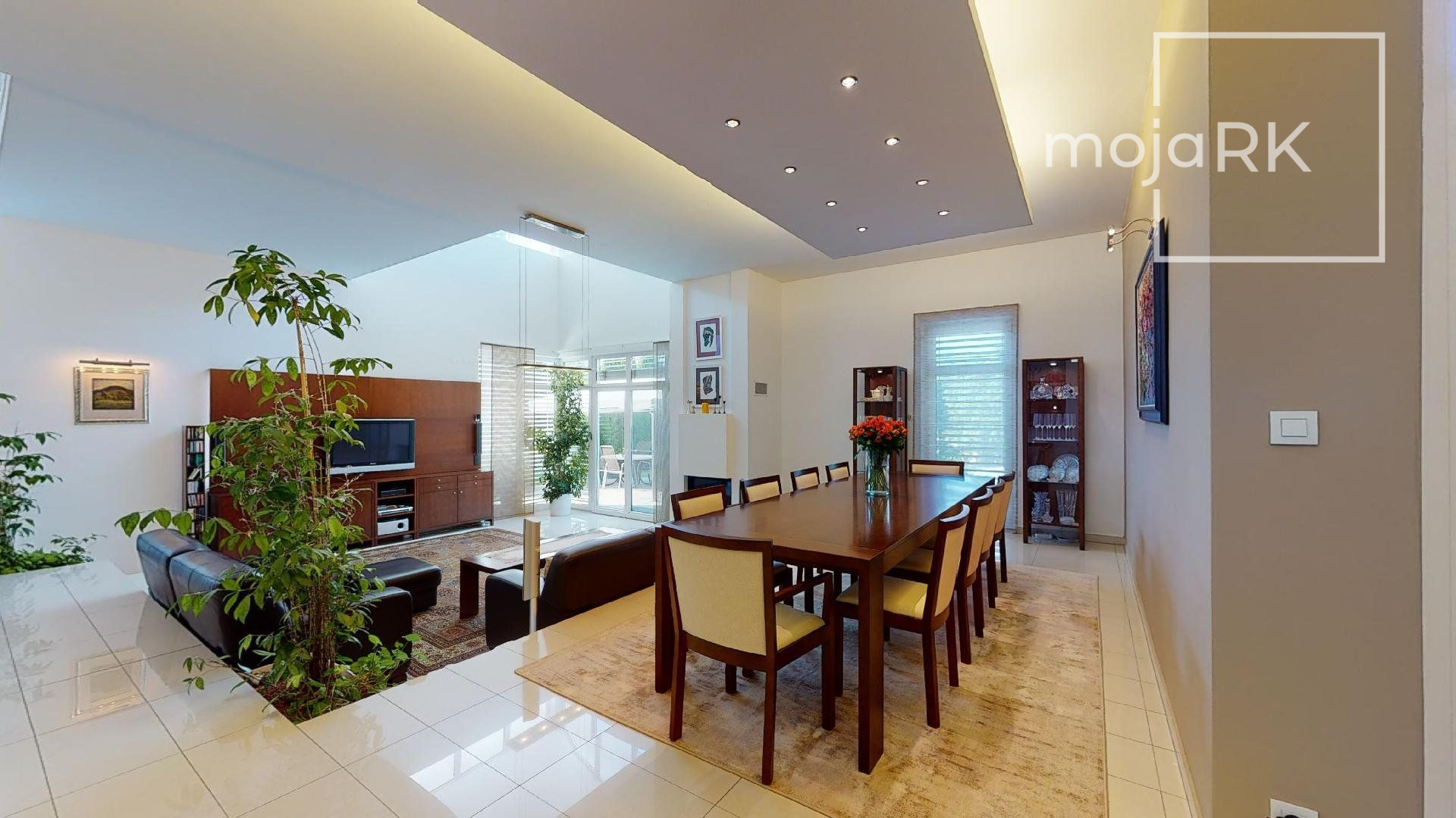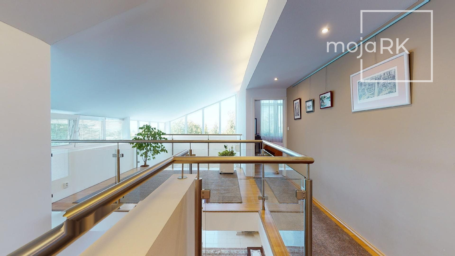 Úžitková plocha domu 422 m2 ponúka: 3 spálne so samostatnými šatníkmi a kúpeľňami, wellness priestor, hosťovskú izbu so samostatnou kúpeľňou, veľkoryso riešenú obývaciu miestnosť prepojenú s jedálňou s krásnym výhľadom na záhradu, kuchyňu so samostatnou komorou, šikovne dispozične umiestnenú pracovňu, galériu, ďalšie dva šatníky, 5 x WC, práčovňu, technickú miestnosť, 2 skladovacie miestnosti, garáž 44,30 m2 pre dve autá s úložným priestorom. Ďalšie 3 parkovacie miesta sa nachádzajú na nádvorí pozemku so zámkovou dlažbou.