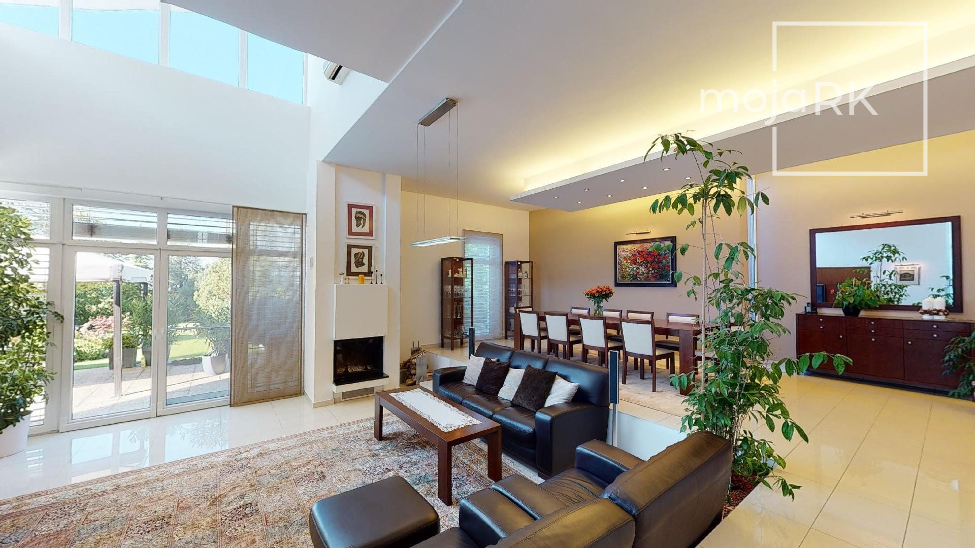 - obývacia miestnosť s krbom, východom na terasu 30 m2 a záhradu