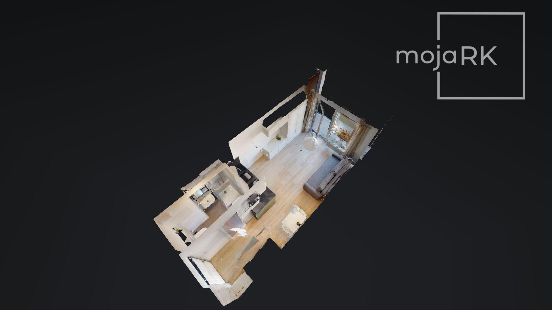 - priestranná izba s kuchynským a jedálenským kútom, obývacia časť spojená so spálňou, balkón s výhľadom do vnútrobloku