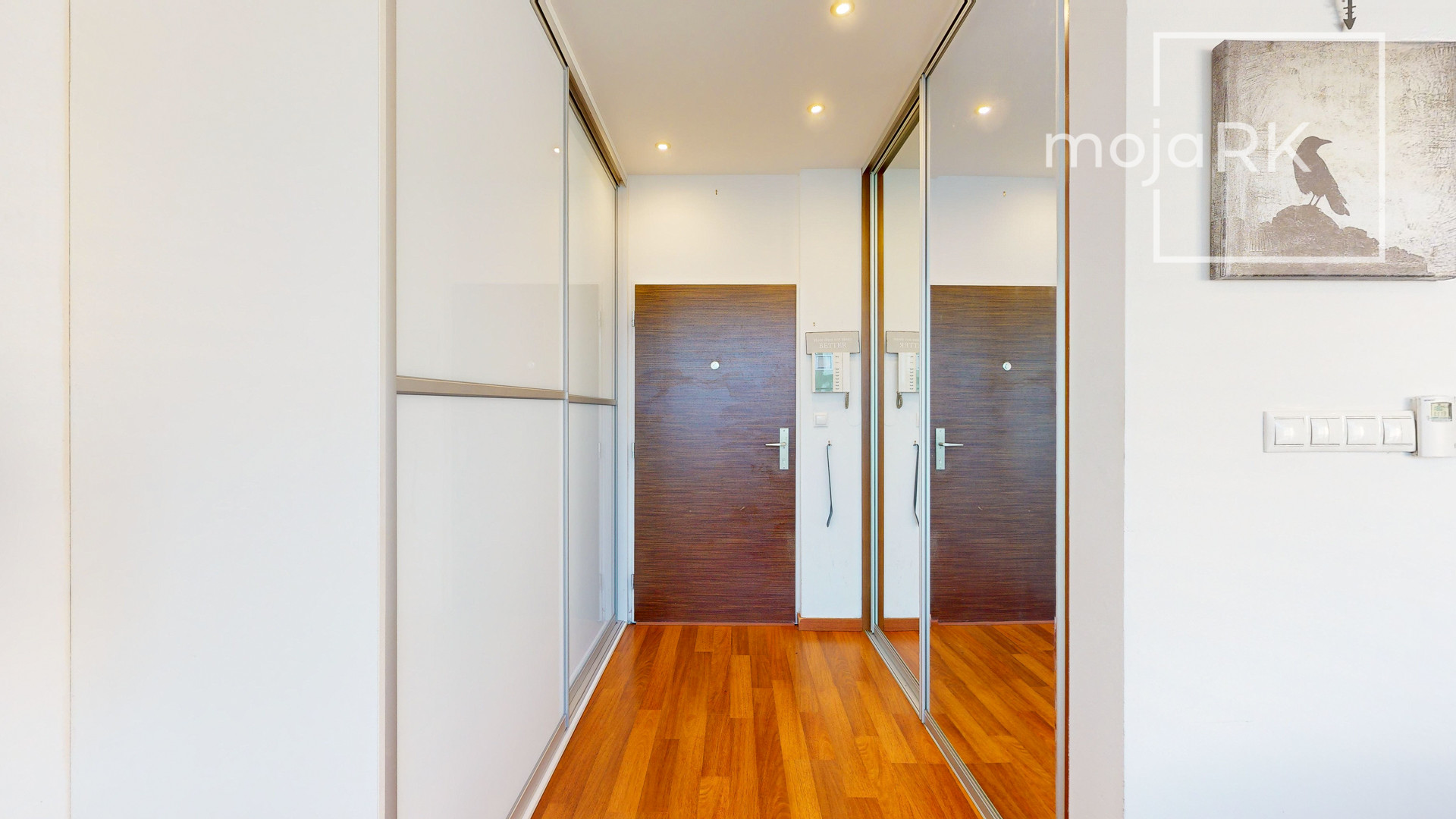 Byt vás privíta praktickým zádverím, kde nájdete veľké vstavané skrine na pohodlné uskladnenie vecí. Odtiaľ plynule prejdete do otvoreného denného priestoru, ktorý spája obývaciu izbu s balkónom, jedálenskú časť a modernú kuchyňu.
