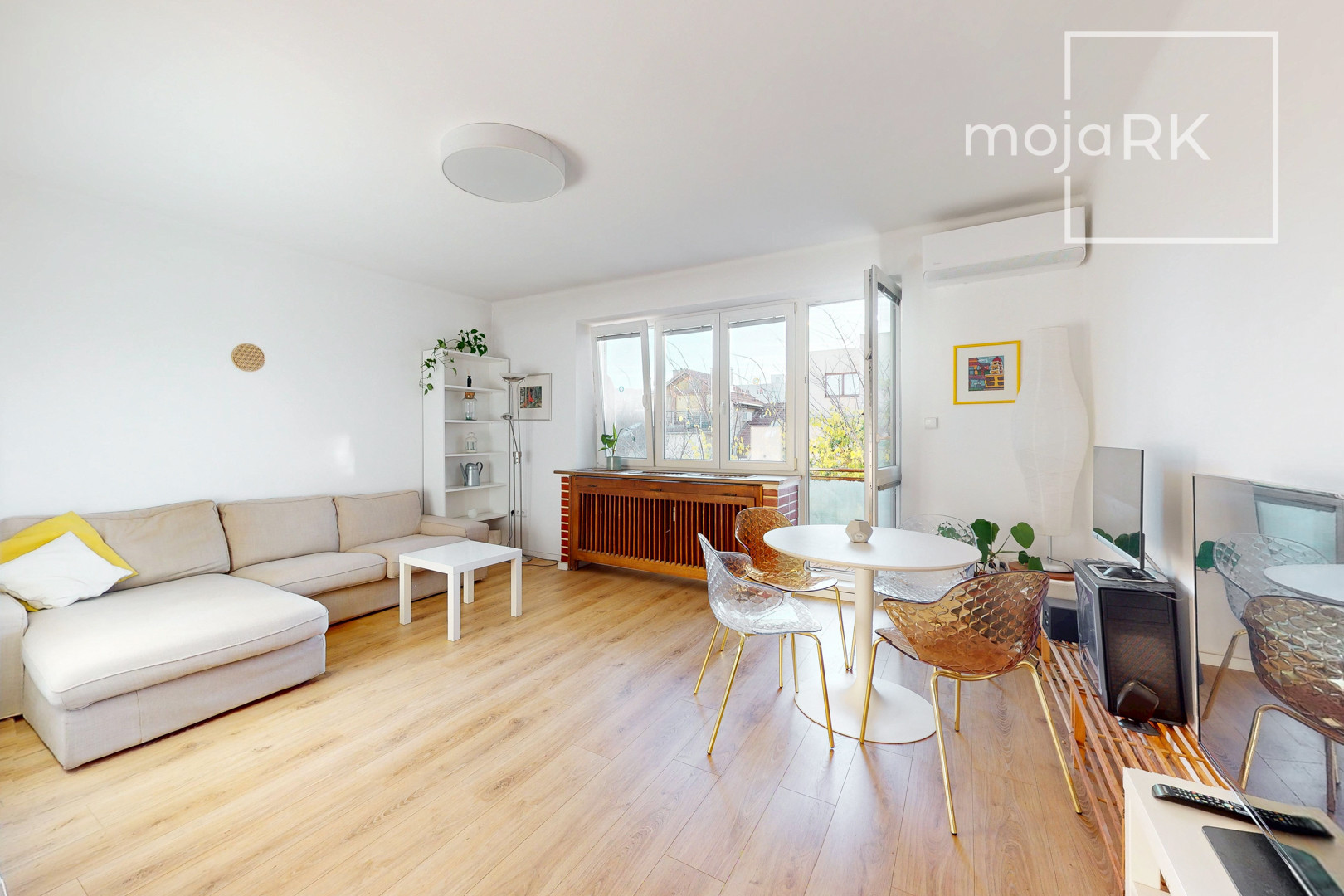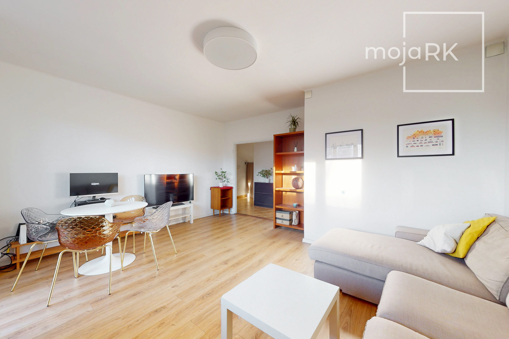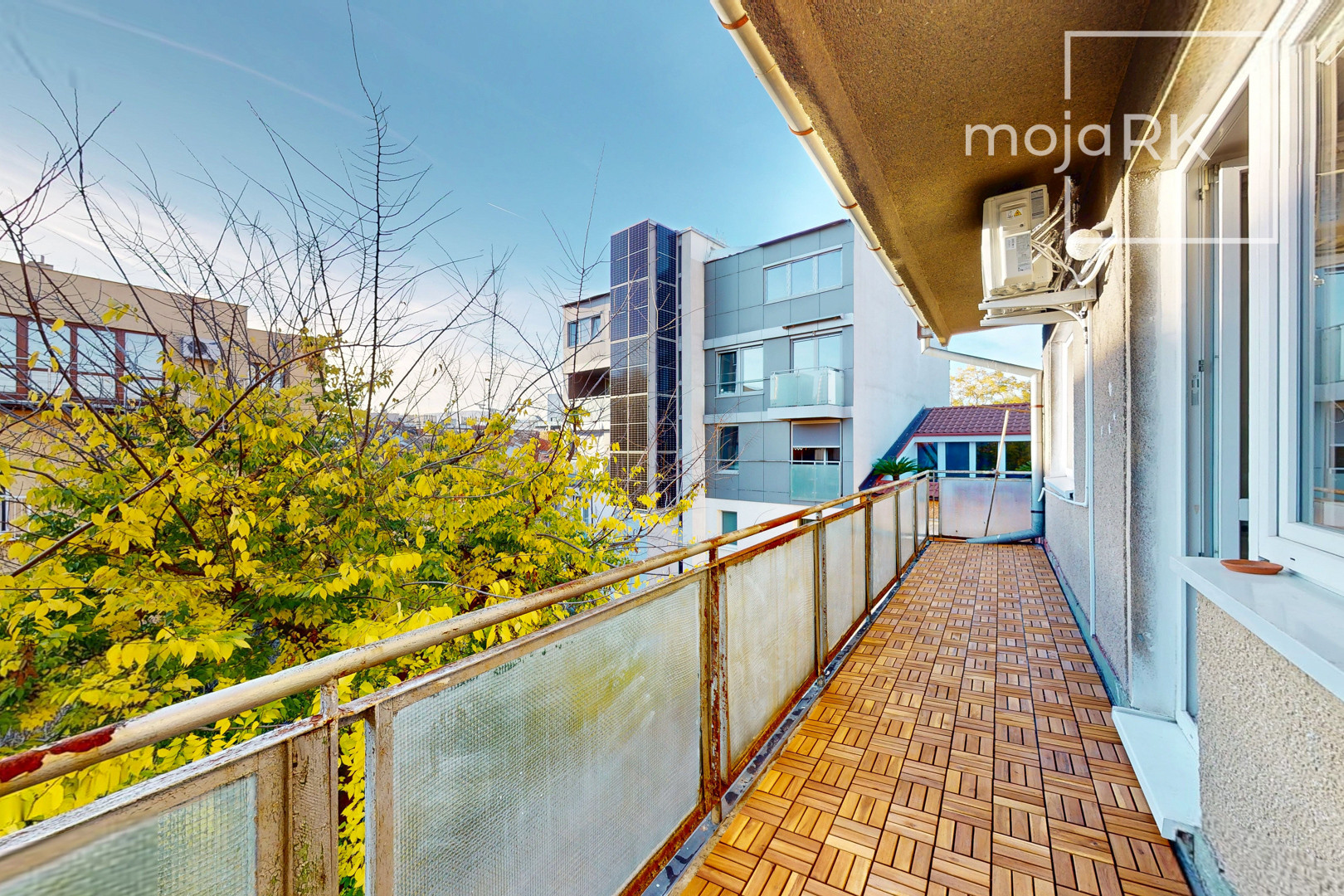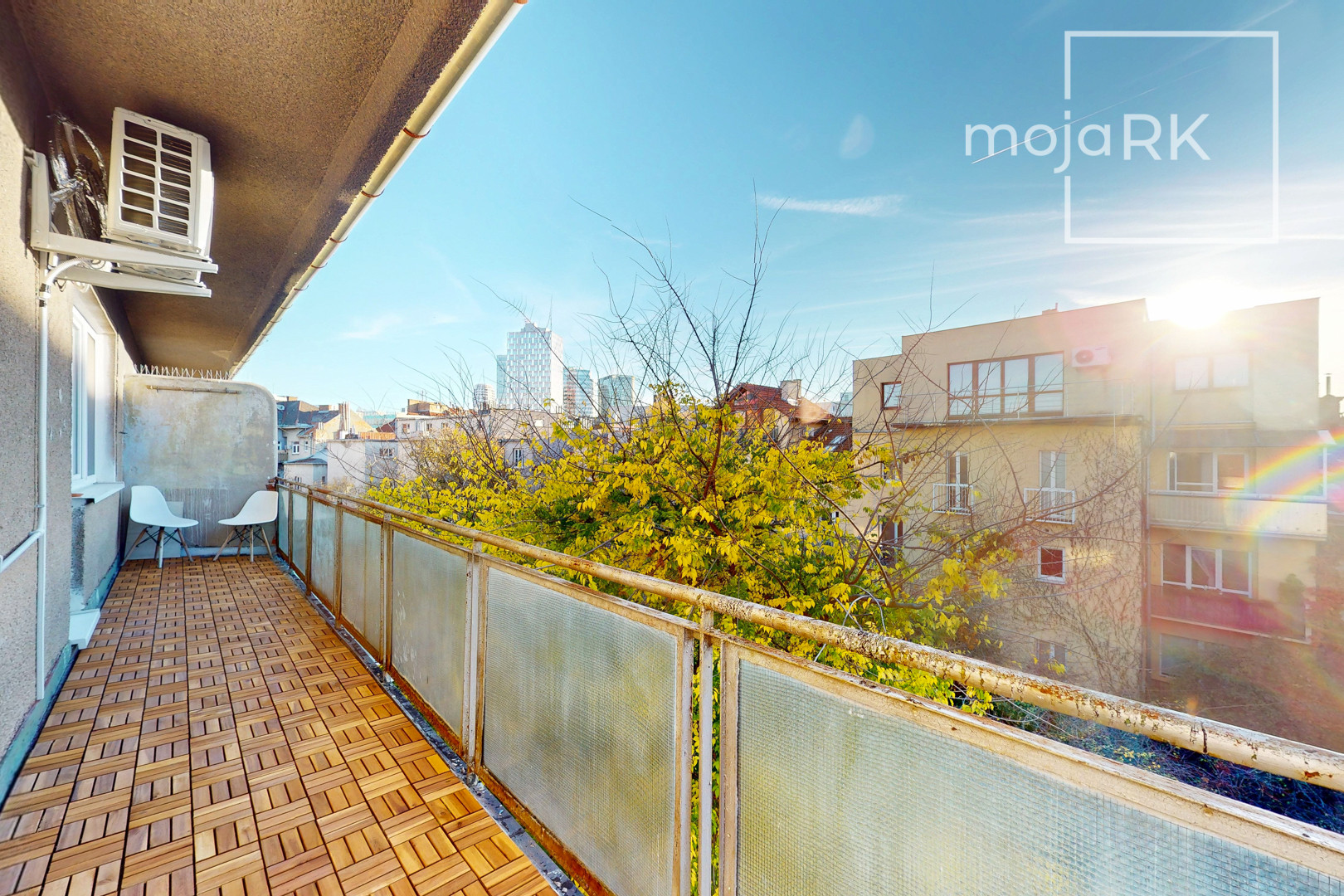 Priestranná obývacia izba má výstup na balkón, ktorý sa tiahne popred obe izby a ponúka výhľad do tichého vnútrobloku, v korunách stromov so siluetou mesta na horizonte.