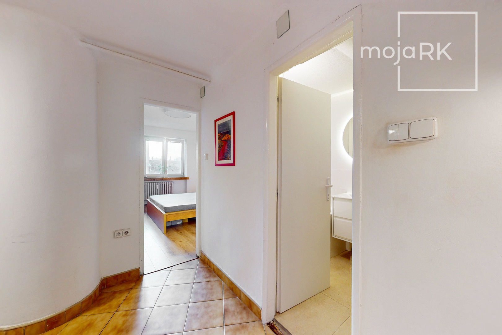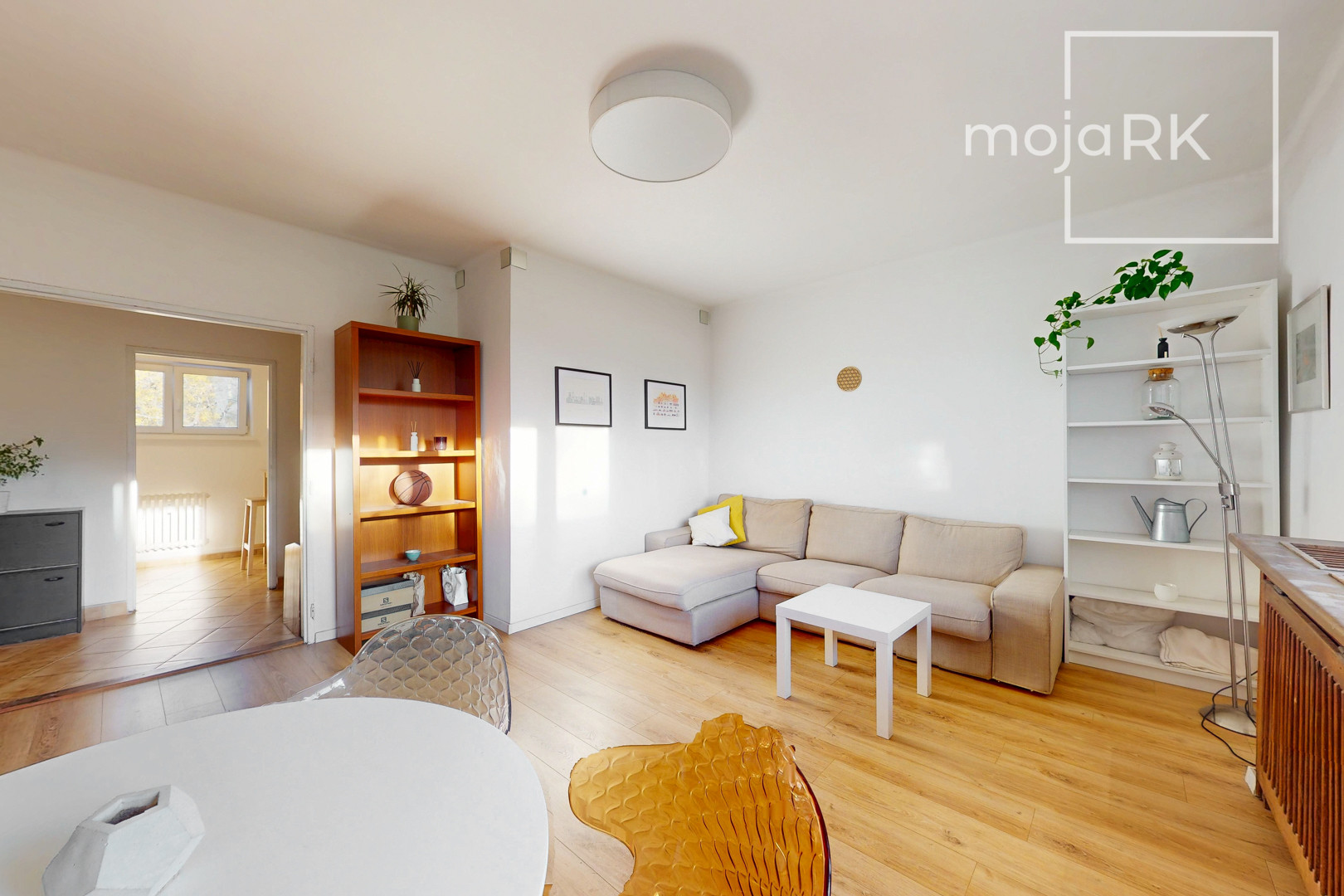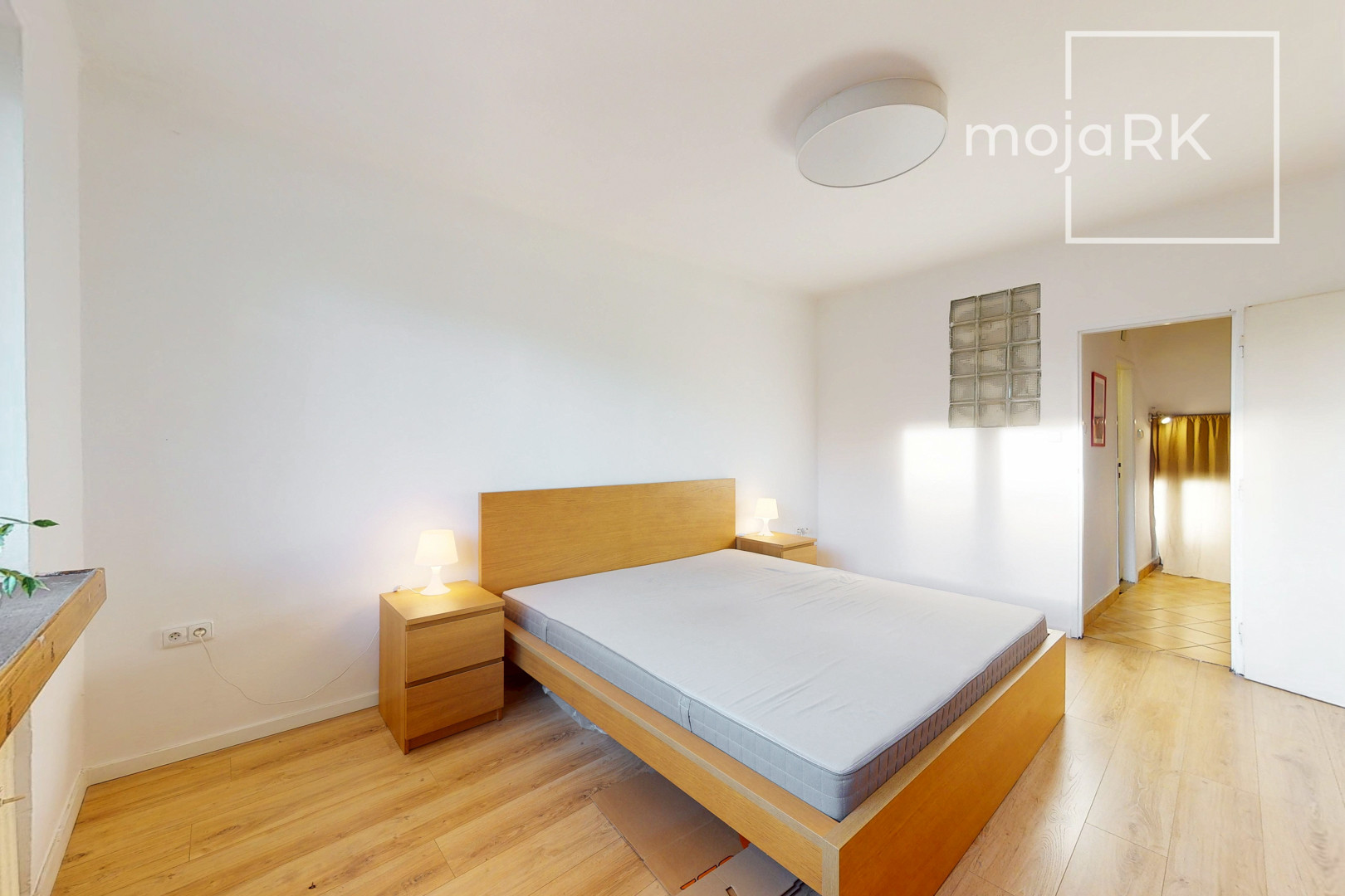 Priestranná obývacia izba má výstup na balkón, ktorý sa tiahne popred obe izby a ponúka výhľad do tichého vnútrobloku, v korunách stromov so siluetou mesta na horizonte.