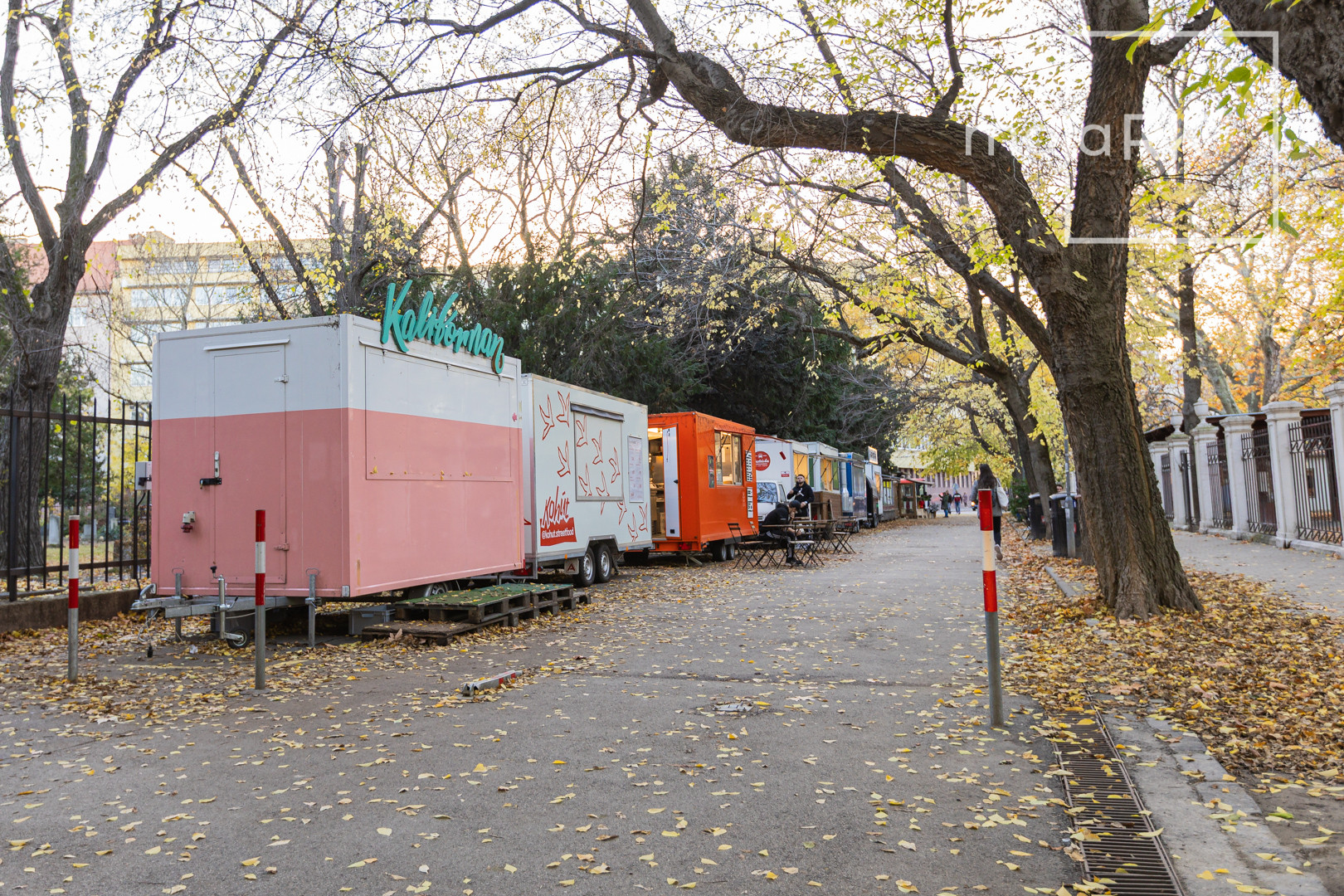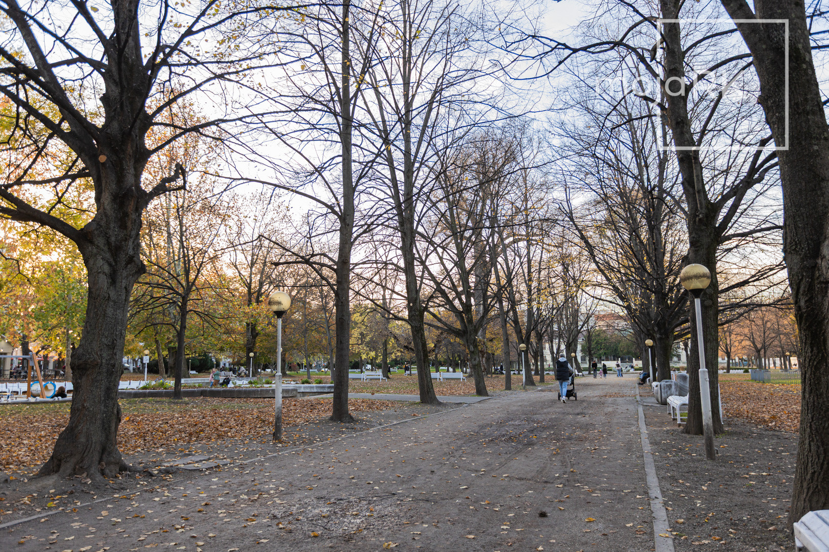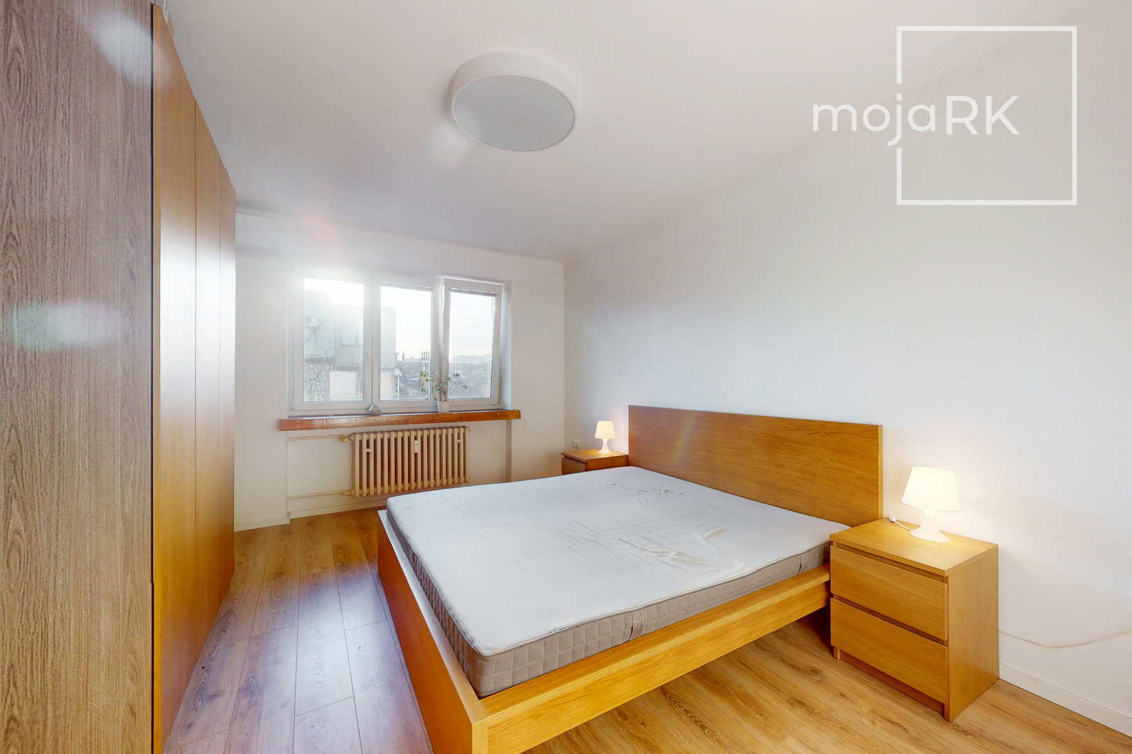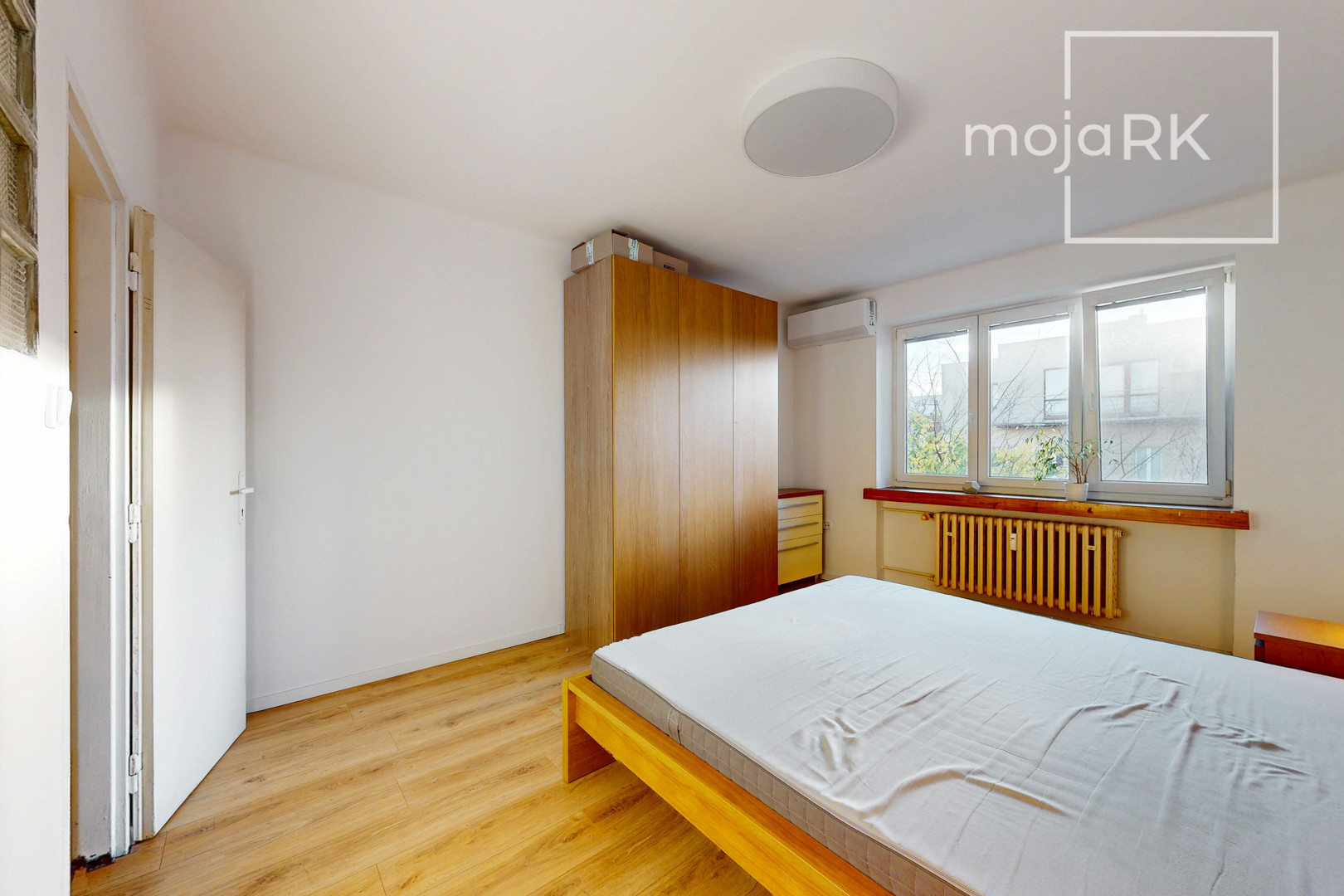 Priestranná obývacia izba má výstup na balkón, ktorý sa tiahne popred obe izby a ponúka výhľad do tichého vnútrobloku, v korunách stromov so siluetou mesta na horizonte.