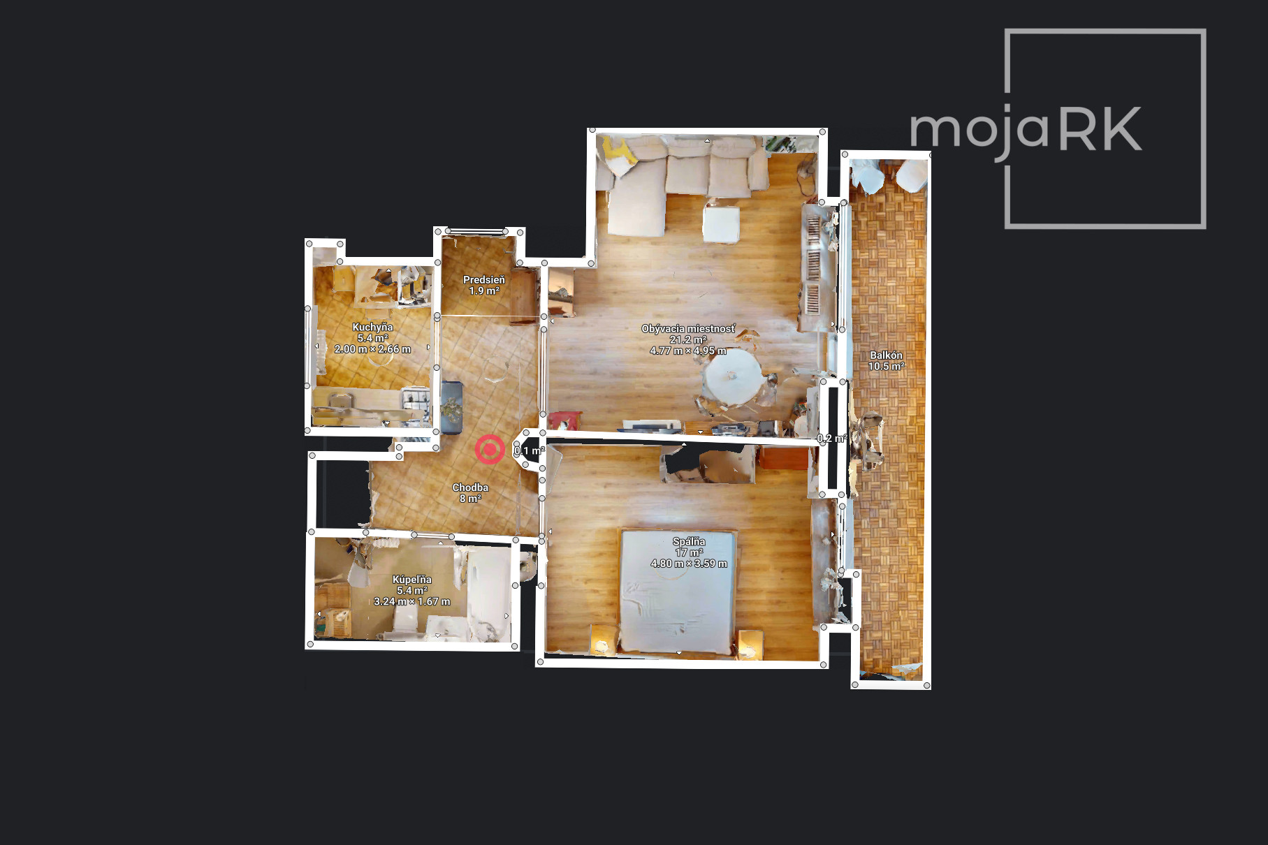 Byt má šikovne riešený pôdorys s neprechodnými izbami – ideálne pre pár alebo jednotlivca, ktorý ocení súkromie aj funkčnosť.