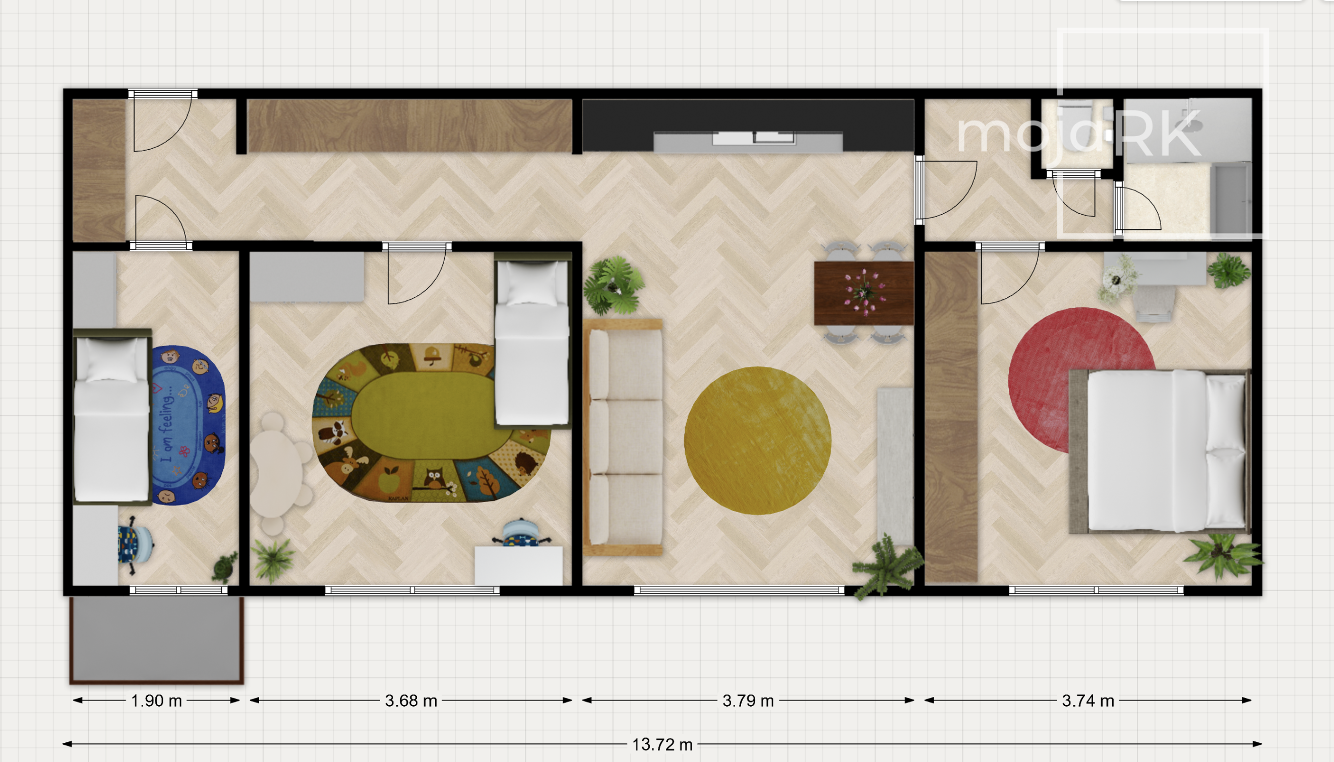 Aj keď výmera bytu patrí medzi kompaktnejšie, vďaka veľmi dobre riešenej dispozícii si ju v praxi takmer neuvedomíte. Po vstupe vás privíta priestranná chodba s dostatkom miesta na vstavané skrine a úložné riešenia. Obývacia izba je prepojená s kuchyňou, čím vzniká otvorený a príjemný denný priestor, ktorý poskytuje dostatok miesta pre každodenný život aj spoločné chvíle s rodinou či priateľmi. Dispozícia bytu zahŕňa dve väčšie spálne s výmerou približne 14 m² a jednu menšiu izbu, ktorá môže slúžiť ako detská izba, pracovňa alebo hosťovská miestnosť. Vďaka tomuto riešeniu poskytuje byt dostatok priestoru aj pre väčšiu rodinu.