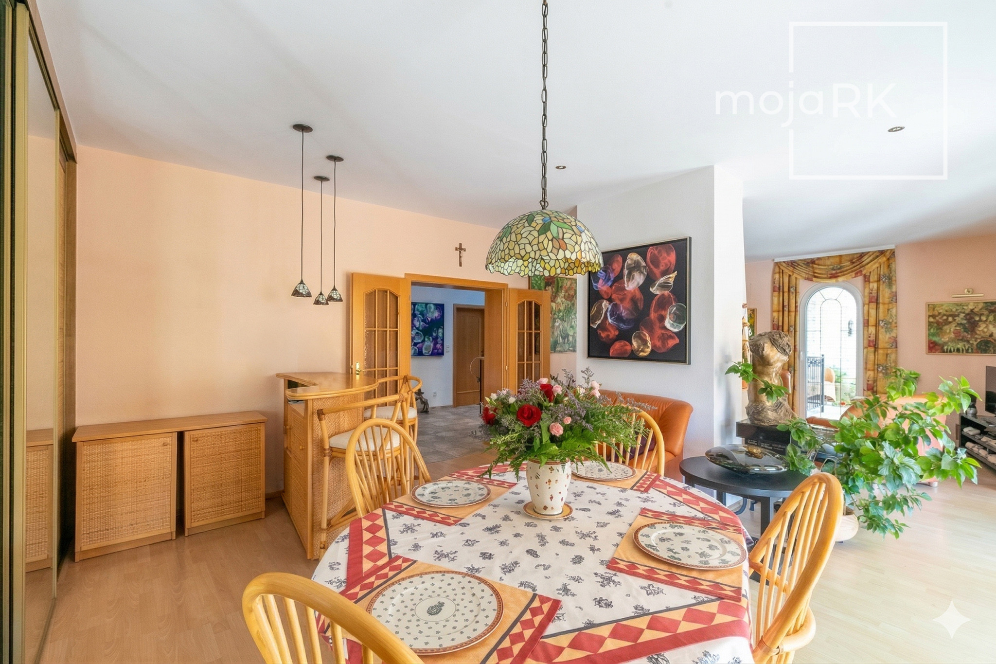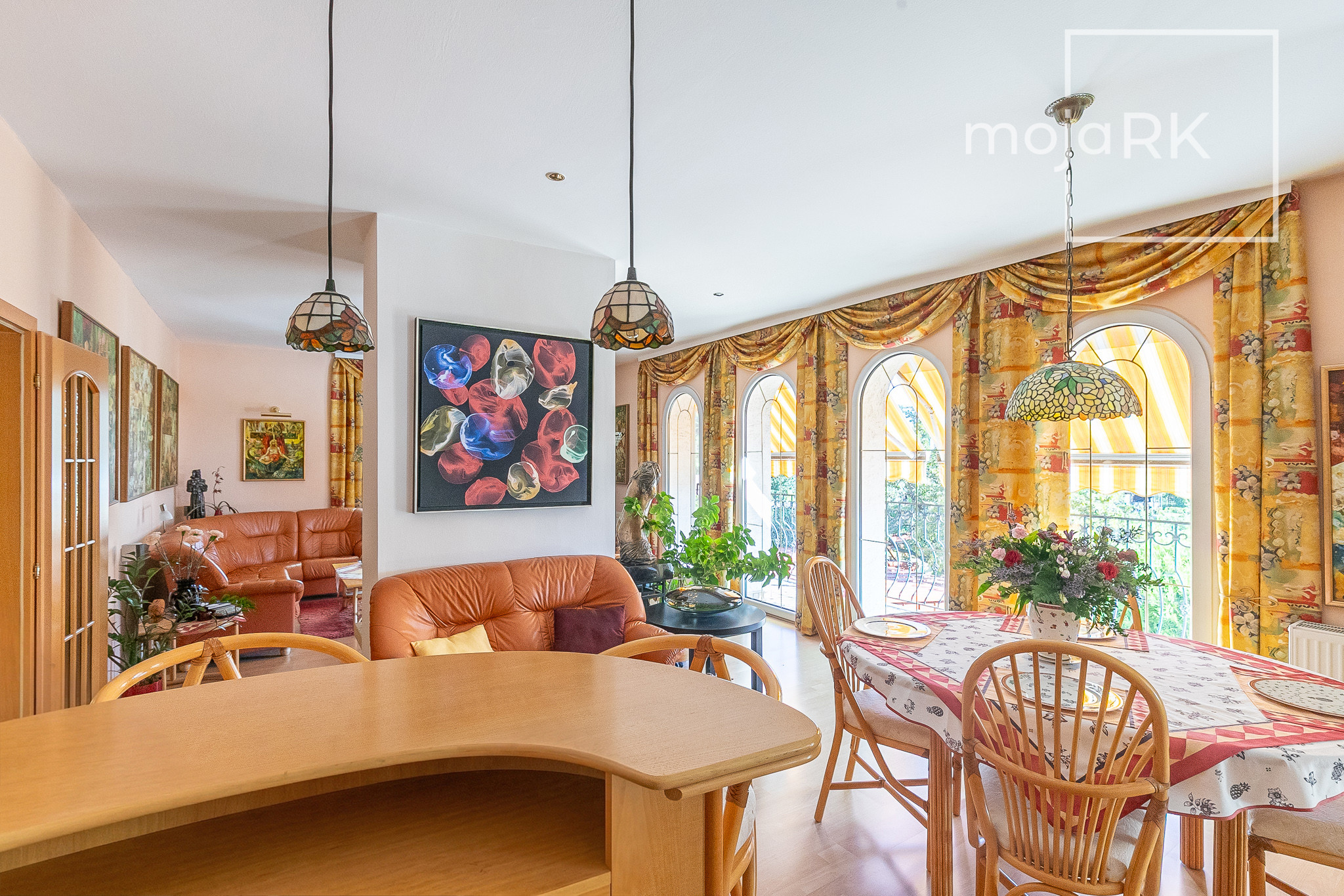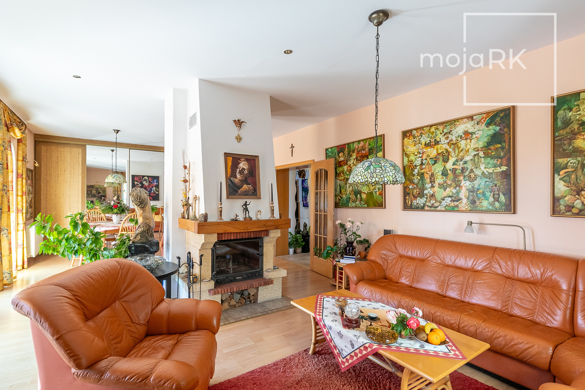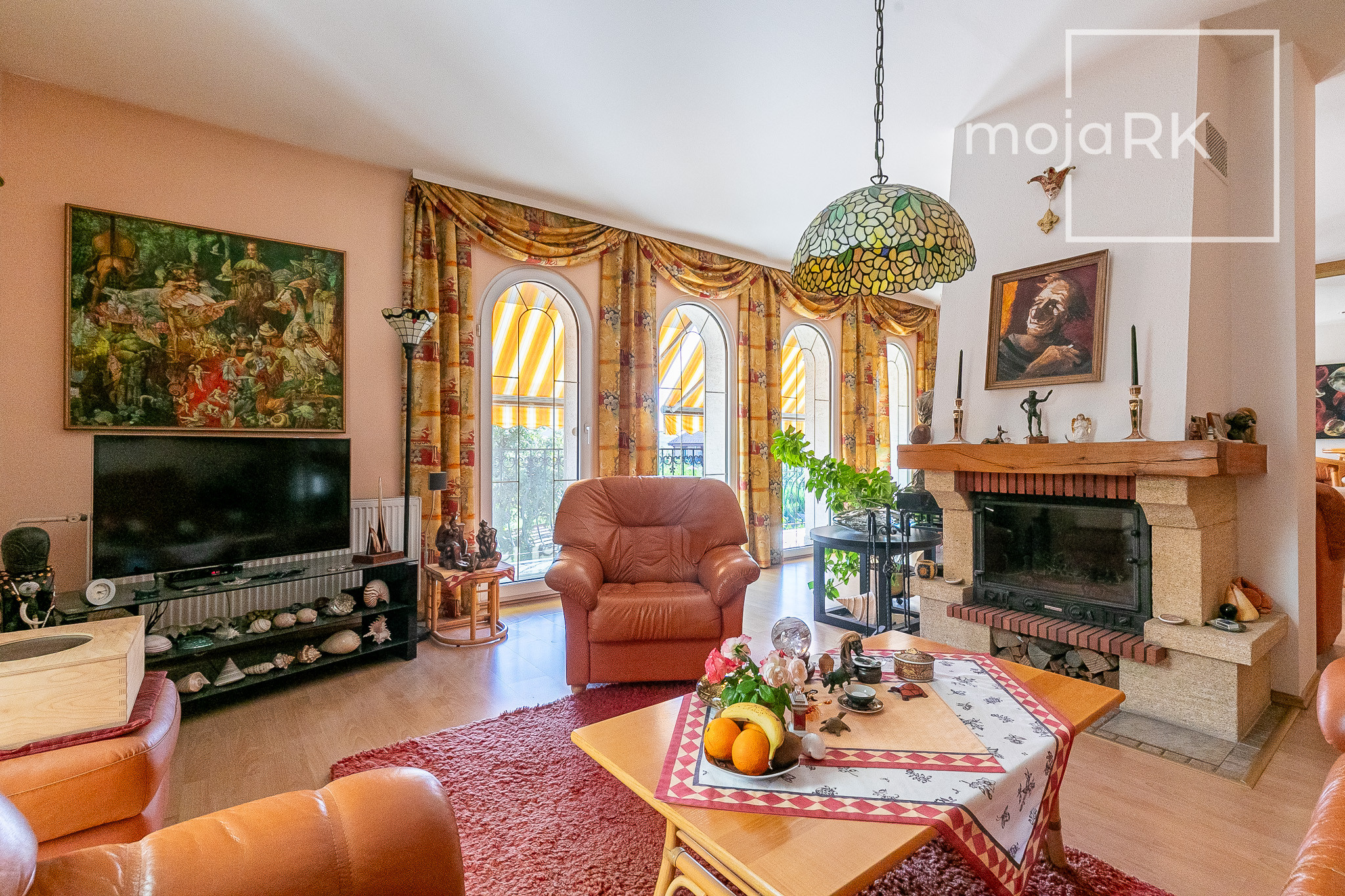 - obývacia izba s krbom prepojená s jedálenskou časťou so vstupom na balkón, ponúka sa výhľad na celú záhradu/Južná strana