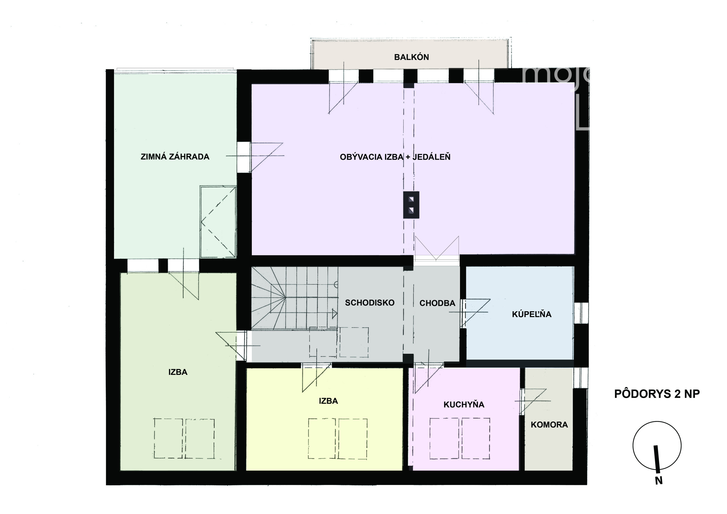 - 2.NP/južne orientované okná: plastové francúzke okná/dvere (výška 2,4 m) s izolačným dvojsklom a exteriérovými markízami